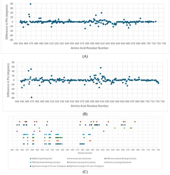 Figure 4A shows the differences in the average phi dihedral angle between drug-resistant and susceptible for each residue in the dabrafenib study. The average difference in psi dihedral angle between sensitive and resistant for the dabrafenib study (Figure 4B). Note that large differences are found between residues 450–470 and 575–635, with smaller regional differences around 510 and around 660. Previous studies have identified that the active site of BRAF variant V600E for vemurafenib and other related drugs consists of residues Ile-463, Gly-464, and Val-471 of the P-loop; Leu-505 and Thr-508 of the αC-helix; Arg-575, Asp-576, Lys-578, Asn-580, and Asn-581 of the catalytic site; Ile-527, Thr-529, Gln-530, Trp-531, Cys-532, Gly-534, Ser-535, Ser-536 and His-539 of the N-lobe; and Phe-583, Gly-593, Glu-600, Lys-601, Arg-603, Tpr-604, and Ser-605 of the C-lobe [17]. These are shown in Figure 4C in blue. The residues that participate in the intermolecular interaction of the drug and BRAF are Val-471, Ala-481, Lys-483, Leu-505, Leu-514, Thr-529, Trp-531, Cys-532, Asp-594, Phe-595, and Gly-596 and are deemed essential for the activity of these class inhibitors are shown in orange [17]. The PDB structure 4RZV of the vemurafenib drug binding site shows residues 463, 471, 472, 481, 482, 483, 505, 514-516, 527, 529–532, 535, 536, 539, 583, and 593–596 as the binding site (dark green). In PDB structure 5CSW, the dabrafenib drug binding site is 463–466, 468, 471, 481, 483, 505, 508, 513–516, 527, 529–532, 580, 581, 583, and 592–595 (light blue). They are all part of the CR3 domain, which is the kinase domain. The feature residues 484 and 518 lie adjacent to contact residues in the drug binding site, and 450 and 495 are close enough to likely affect drug binding, as shown in Figure 5.
