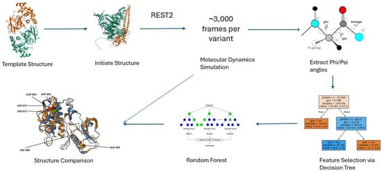 The workflow of this computational study is shown in Figure 6. It consists of obtaining a template structure, obtaining an initial structure, performing REST2 molecular dynamics simulation, extracting the phi and psi dihedral angles, performing feature selection using classification trees, building a random forest machine learning model to classify variants, and structural analysis.