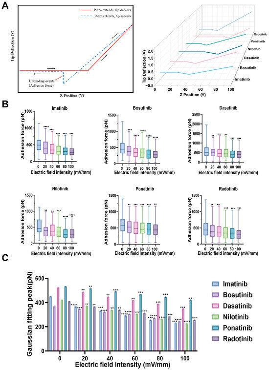Proteins undergo a series of conformational changes under the influence of an external electric field, thereby altering their function and properties [9]. Consequently, the interactions between proteins and drugs also change accordingly. To evaluate how electric fields influence the interfacial binding behavior of serum proteins in drug environments, we first measured the adhesion forces between HSA molecules in the presence of six different tyrosine kinase inhibitors (TKIs, imatinib, bosutinib, dasatinib, nilotinib, ponatinib, radotinib) under varying electric field strengths (0–100 mV/mm) using atomic force microscopy (AFM). Figure 3A (take the example of an electric field of 20 mV/mm.) shows the F–D curve obtained during the measurement of adhesion force. Based on the F–D curve, sufficient adhesion force data values were obtained, which were used for two complementary analyses: displaying the statistical distribution of adhesion force values via a box plot (Figure 3B), and performing a Gaussian fitting on the force histogram to extract the most likely adhesion force values (Figure 3C).