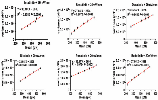 Linear fitting analysis of the relationship between the mean adhesion force (μm) and the force variance (σ2m) for HSA molecules in the presence of six different TKIs (20 mV/mm), measured by AFM-based force spectroscopy. Each data point represents the average value obtained from multiple force–distance curves, and error bars indicate the standard deviation. The fitted lines were analyzed based on the Poisson model to separate the specific force (Fi) and non-specific force (F0).The corresponding R2 values and fitted equations are shown in the figure.
