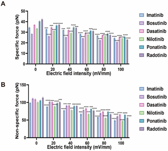 In conclusion, an increase in electric field strength systematically weakens both the specific and non-specific interaction forces between HSAs, with the most significant effect observed on non-specific binding force (F0). The extent of this modulation varies among different TKIs, reflecting differences in their physicochemical binding mechanisms. These findings suggest that electric fields can serve as a powerful tool for detecting and potentially modulating drug-protein interactions, with significant implications for regulating pharmacokinetics and drug release characteristics in biomedical applications [37,38].