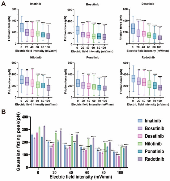 Given the influence of electric fields on binding forces, we next examined how these fields affect frictional interactions at the HSA–TKI interface using loop friction mode in AFM. This nanotribological analysis reflects dynamic contact responses relevant to protein–drug interface stability. Figure 6 summarizes the influence of electric field strength on the intermolecular frictional forces of HSA in the presence of different TKI drugs, providing indirect insights into the regulation of drug–protein interaction dynamics. Friction forces were measured using atomic force microscopy (AFM), with their distribution analyzed via box plots (Figure 6A) and Gaussian-fitted peaks (Figure 6B). Among the six TKI drugs studied, it was observed that the overall friction force decreased upon the application of an electric field, and there was a trend of friction force decreasing with increasing electric field strength; however, the extent of decrease varied among different drugs.
