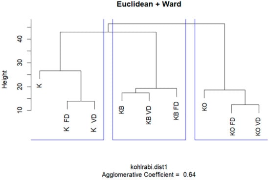 Statistical analyses were performed using Statistica version 13.3 (StatSoft, Kraków, Polska). One-way analysis of variance (ANOVA) using Duncan’s test was used to compare the mean values. Differences were considered to be significant at p < 0.05. Statistical analyses were performed using R software (R Core Team, 2024). Prior to analysis, the numerical data were standardized. To explore similarities and differences in the composition of major volatile organic compounds (VOCs), hierarchical cluster analysis (HCA) was applied using Ward’s method and Euclidean distance. The results allowed the classification of the samples into three distinct groups. Additionally, principal component analysis (PCA) was performed to determine the relationships between physicochemical properties of kohlrabi and the drying method and vacuum impregnation process.