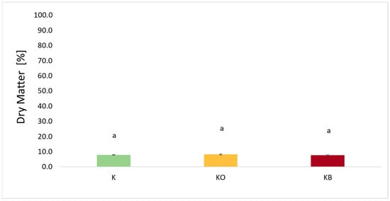 The effect of the vacuum impregnation process on the dry matter content in fresh kohlrabi (K), kohlrabi after VI with onion juice (KO), and kohlrabi after VI with beetroot juice (KB). The values marked with different lowercase letters indicate significant differences (p < 0.05).