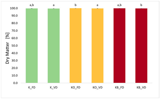 The effect of the vacuum impregnation process on the dry matter content in dried kohlrabi (K), kohlrabi after VI with onion juice (KO), and kohlrabi after VI with beetroot juice (KB). FD—freeze-drying, VD—vacuum drying. The values marked with different lowercase letters indicate significant differences (p < 0.05).