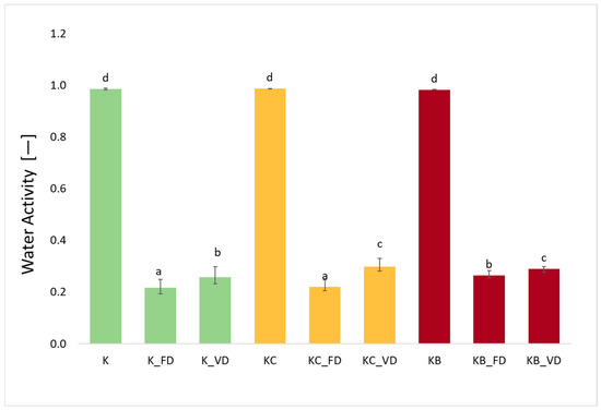 The effect of the vacuum impregnation process and drying method on the water activity in kohlrabi (K), kohlrabi after VI with onion juice (KO), and kohlrabi after VI with beetroot juice (KB). FD—freeze-drying, VD—vacuum drying. The values marked with different lowercase letters indicate significant differences (p < 0.05).