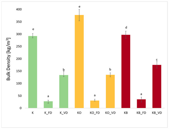 The effect of the vacuum impregnation process and drying method on the bulk density in kohlrabi (K), kohlrabi after VI with onion juice (KO), and kohlrabi after VI with beetroot juice (KB). FD—freeze-drying, VD—vacuum drying. The values marked with different lowercase letters indicate significant differences (p < 0.05).