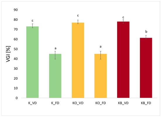 The effect of the vacuum impregnation process and drying method on the Volumetric Gel Index in kohlrabi (K), kohlrabi after VI with onion juice (KO), and kohlrabi after VI with beetroot juice (KB). FD—freeze-drying, VD—vacuum drying. The values marked with different lowercase letters indicate significant differences (p < 0.05).