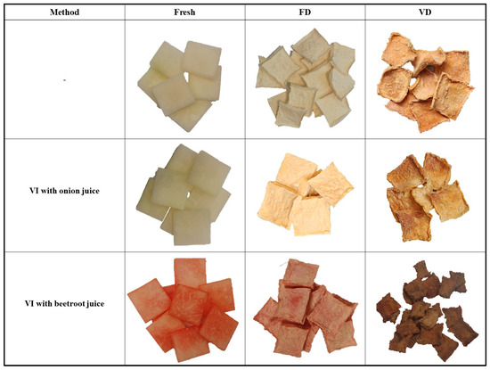 Visual comparison of selected kohlrabi pieces subjected to vacuum impregnation (VI) using onion and beetroot juice. FD—freeze-drying; VD—vacuum drying.