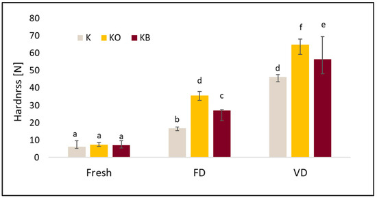 The effect of vacuum impregnation on the hardness of kohlrabi (K), kohlrabi after VI with onion juice (KO), and kohlrabi after VI with beetroot juice (KB). FD—freeze-drying, VD—vacuum drying. The values marked with different lowercase letters indicate significant differences (p < 0.05).