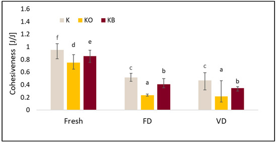 The effect of vacuum impregnation on the cohesiveness of kohlrabi (K), kohlrabi after VI with onion juice (KO), and kohlrabi after VI with beetroot juice (KB). FD—freeze-drying, VD—vacuum drying. The values marked with different lowercase letters indicate significant differences (p < 0.05).