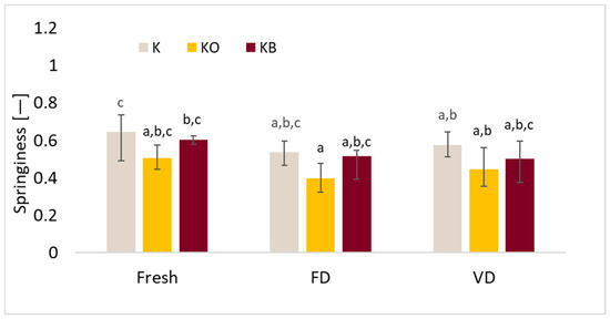 The effect of vacuum impregnation on the springiness of kohlrabi (K), kohlrabi after VI with onion juice (KO), and kohlrabi after VI with beetroot juice (KB). FD—freeze-drying, VD—vacuum drying. The values marked with different lowercase letters indicate significant differences (p < 0.05).