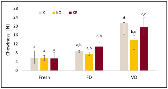 The effect of vacuum impregnation on the chewiness of kohlrabi (K), kohlrabi after VI with onion juice (KO), and kohlrabi after VI with beetroot juice (KB). FD—freeze-drying, VD—vacuum drying. The values marked with different lowercase letters indicate significant differences (p < 0.05).