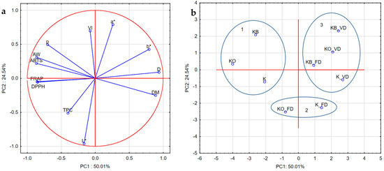 Loading plot (a) and score plot (b) of the principal component analysis (PC1 and PC2) carried out for dried kohlrabi. VI: vacuum impregnation; D: drying methods; DM: dry matter, AW: water activity; L*: lightness; a*, b*: parameters color; p: bulk density; ABTS, DPPH, and FRAP: antioxidant capacity; TPC: total phenolic content; FD: freeze-drying, VD: vacuum drying, 1,2,3: groups of parameters with similar characteristics.