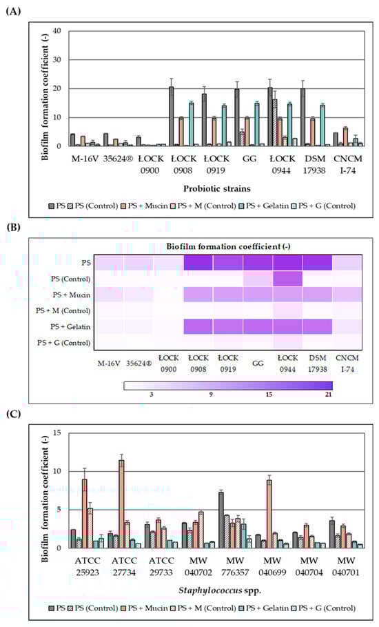 The addition of the extract to the culture medium promoted biofilm formation by probiotic strains. The highest biofilm-forming capacities in the presence of the extract were observed for lactic acid bacteria strains L. casei ŁOCK 0908, L. paracasei ŁOCK 0919, L. rhamnosus GG, L. brevis ŁOCK 0944, and L. reuteri DSM 17938, with BFC values ranging from 16 to 24 (PS), 9 to 11 (PS + M), and 14 to 16 (PS + G). However, the lowest BFC values were recorded for B. breve M-16V, B. infantis 35624®, and L. casei ŁOCK 0900, with values of 3–5 (PS), 0.4–3.5 (PS + M), and 0.7–2 (PS + G), respectively. The probiotic yeast S. boulardii CNCM I-745 exhibited intermediate biofilm-forming ability, falling between bifidobacteria and lactic acid bacteria.