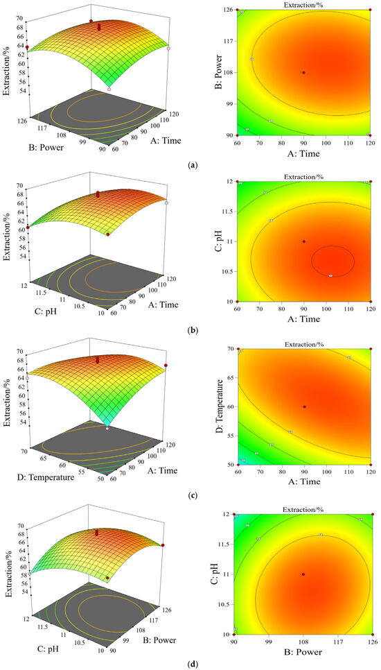 As shown in Figure 2, the contour plots and RSM analysis revealed significant interactions between the factors. The degree of interaction was indicated by the ellipticity of the contour lines, with more elliptical contours representing stronger interactions. Similarly, the steepness of the RSM reflected the intensity of the factor effects, where steeper surfaces correspond to more pronounced interactions [30]. The RSM results showed that with increasing levels of A, B, C, and D, the SPP extraction yield first increased and then decreased, which was consistent with the results presented in Table 2. The optimal SPP extraction conditions obtained through RSM screening were as follows: an ultrasonic time of 120 min, a power of 115 W, a temperature of 54 °C, and pH of 10.5. The predicted theoretical extraction yield of SPP under optimized conditions was 68.139%. To verify the optimization, three parallel experiments were conducted under an ultrasonic time of 120 min, a power of 115 W, a temperature of 54 °C, and pH of 10.5. The average SPP extraction yield from three parallel experiments reached 68.087%, which closely matched the predicted value (68.139%). This confirmed the adequacy of the response model for the optimization process [31]. And compared with the untreatment group (60.977%), the extraction yield significantly increased by 7.11% (p < 0.05).