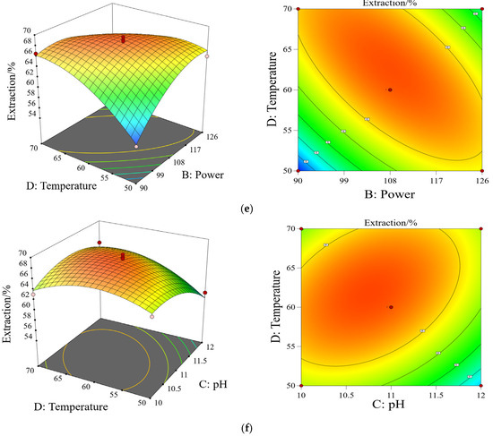 The curve and contour plot of interaction of various factors on the extraction yield of SPP. Note: Response surface and contour plots of the effects of (a) ultrasound time and ultrasound power; (b) ultrasonic time and pH; (c) ultrasound time and temperature; (d) Ultrasonic power and pH; (e) Ultrasonic power and temperature; (f) Ultrasonic temperature and pH.