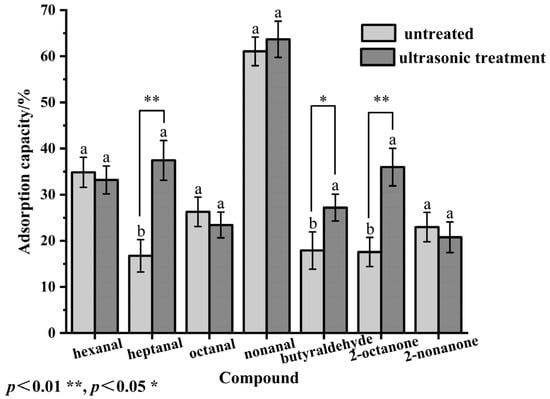 Effect of ultrasonic treatment on the adsorption capacity of flavor compounds. Data were expressed as means ± SEM. Labeled characters with different letters represent significant differences at p < 0.05.