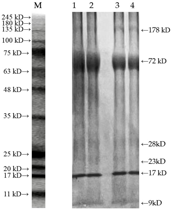 Following the method described by Yang et al. [72], a 5 g/L SPP solution was prepared by dissolving SPP powder in 10 mL of 1% (w/v) NaOH with continuous stirring at 25 ± 1 °C for 2 h. Then, 20 μL of the protein solution was mixed with 10 μL of 2× SDS loading buffer, shaken for 30 s, heated in boiling water (100 °C) for 5 min, cooled to room temperature and then centrifuged for 5 min at 10,000 r/min. Then, 20 μL supernatant and 20 μL marker were injected into the lane. In the first stage, the voltage was adjusted to 80 V, and then, it was added to 135 V after the bromophenol blue was completely moved to the separation gel. When the bromophenol blue migrated to the bottom, the electrophoresis was finished.