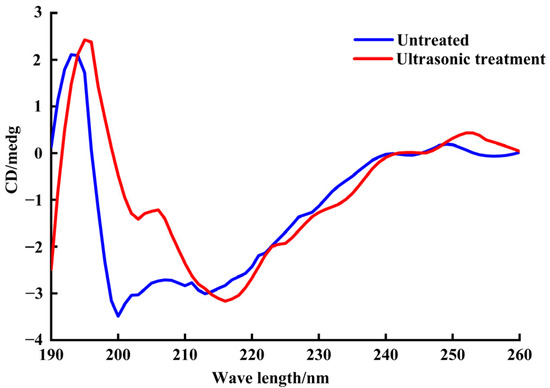 According to Hegde et al. [71], the conditions for circular dichroism scanning (DM245 circular dichroism spectrometer Olis Instruments Co., Ltd., Athens, GA, USA) were as follows: the mass concentration of protein sample was 1 mg/L, the optical diameter of the sample cell was 0.1 cm, the scanning rate was 1 nm/s, the response time was 1 s, and the buffer solution was used as a blank.