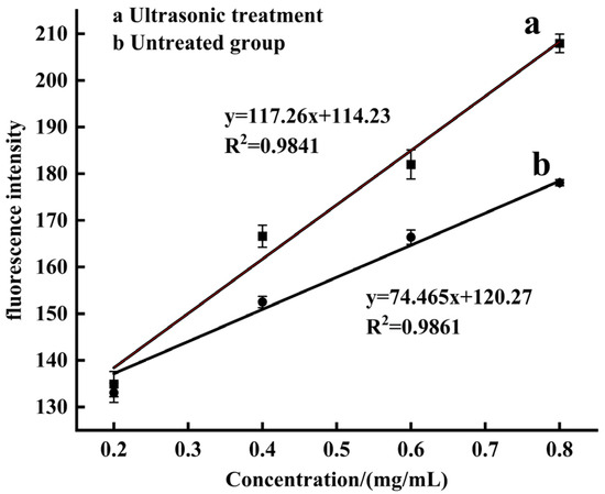 Protein surface hydrophobicity is a critical indicator of the number of hydrophobic groups exposed to a polar environment [41]. In Figure 6, ultrasonic treatment elevated the S0 value by 57.5%, from 74.465 ± 2.64 to 117.26 ± 1.35 (p < 0.05), indicating the surface hydrophobicity of SPP was significantly increased by 1.6-fold after ultrasonic treatment, which could be caused by acoustic cavitation, generated localized high temperatures, high pressures, and intense shear forces, disrupting the higher-order structure of proteins [49], inducing the unfolding of the protein, and exposing hydrophobic groups [50]. This structural modification not only enhanced the surface hydrophobicity but also improved the emulsifying capacity of SPP (Table 3) [51], as hydrophobic regions played a key role in adsorbing at the oil−water interface and stabilizing emulsion droplets [52]. In this study, we observed a positive correlation between surface hydrophobicity and SPP solubility, which was consistent with the finding of Li et al. [53]. This phenomenon was governed by the equilibrium between attractive and repulsive forces among protein molecules, which depended on ultrasound-induced intermolecular conformational changes. Within the optimal ultrasonic power range, the molecular structure of insoluble protein aggregates became looser, promoting the reorganization of soluble proteins. Meanwhile, ultrasonication simultaneously reduced particle size, expanded interfacial contact area and enhanced protein−water interactions, collectively improving protein solubility. However, when ultrasonic intensity exceeded the optimal range, excessive protein denaturation and insoluble aggregate formation decreased solubility. The experimental results demonstrated that the optimized process conditions in this study effectively enhanced the functional properties of SPP.