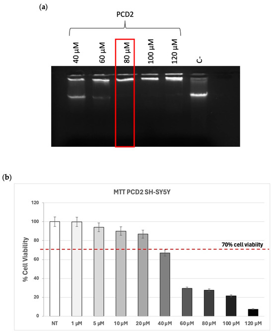 Group 1 formulation. (a) Complex formation between 1 µg of λDNA and PCD2 formulation at the indicated doses of DDAC. The red frame indicates the DDAC dose of liposomes at which the formation of the complex with the λDNA occurred. The negative control (C−) represents PCD2 liposome not incubated with λDNA; (b) MTT assay on SH-SY5Y cells treated with PCD2 formulation at the selected doses (1–120 µM) for 24 h. Cell viability is expressed as a percentage compared to non-treated (NT) cells. The accepted cell viability was considered to be 70%. Data are the mean of three different experiments + s.d.