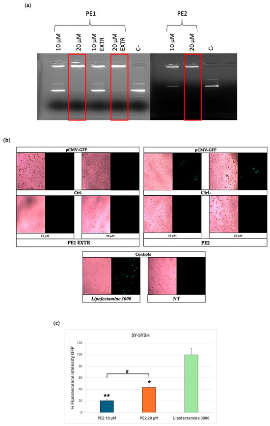 Group II formulations. (a) Complex formation between pCMV-GFP and PE1/PE2 formulations at the indicated doses of DDAC assessed by agarose gel electrophoresis. The red frames indicate the DDAC doses of liposomes at which the formation of the complex with the pCMV-GFP occurred. The negative control (C−) represents PE liposomes not incubated with pCMV-GFP. (b) Expression of GFP in SY-5YSH cells transfected with PE-pCMV-GFP lipoplexes at 10 and 20 µM of DDAC. The green staining represents GFP. Lipofectamine 3000 was used as a positive control, the negative controls (Ctrl−) are cells treated with the PE formulations without pCMV-GFP, whereas the not-treated (NT) cells represent cells left untreated. Images were taken at 10× magnification; scale bar is 200 µm. (c) Quantification of the GFP fluorescent signal in SY-5YSH cells transfected with PE2-pCMV-GFP lipoplexes by ImageJ V1.53 software. Data are the mean of three different experiments + s.d.; * p < 0.01 and ** p < 0.001 for PE2 10 µM or PE2 20 µM vs. Lipofectamine 3000; and # p < 0.01 as indicated by 2-way ANOVA followed by Tukey’s post hoc comparison test.