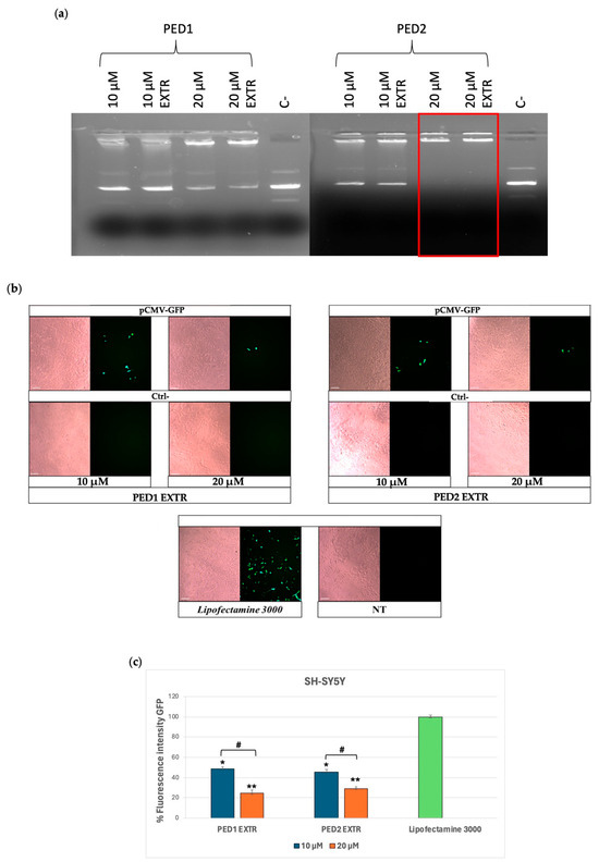Group III formulations. (a) Complex formation between pCMV-GFP and PED EXTR formulations at the indicated doses of DDAC assessed by agarose gel electrophoresis. The red frames indicate the DDAC doses at which the formation of the complex occurred. The negative control (ctrl−) represents cells treated with the two formulations not carrying pCMV-GFP. (b) Transfection of SY-5YSH cells with PED EXTR formulations-pCMV-GFP lipoplex at 10 and 20 µM of DDAC. Lipofectamine 3000 was used as a positive control; the negative control (Ctrl−) represents cells treated with PED liposomes not carrying the pCMV-GFP, whereas the not-treated (NT) cells represent cells left untreated. Images were taken at 10× magnification; scale bar is 200 µm. (c) Quantification of the fluorescent expression levels of GFP in transfected SY-5YSH cells with PED liposomes by ImageJ V1.53 software. Data are the mean of three different experiments + s.d.; * p < 0.01 and ** p < 0.001 for PED1 EXTR 10 µM or PED2 EXTR 20 µM vs. Lipofectamine 3000; and # p < 0.01 as indicated by 2-way ANOVA followed by Tukey’s post hoc comparison test.