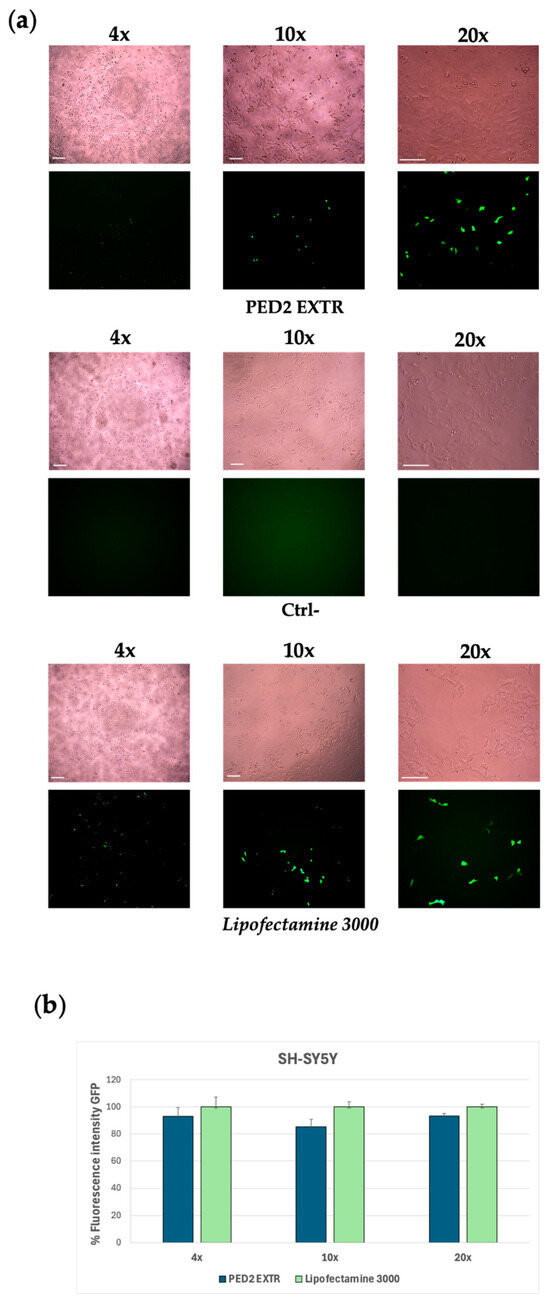 Although a specific cytotoxicity assay (e.g., MTT) was not performed for PED2 EXTR, all transfection experiments were conducted using DDAC concentrations (10–20 µM) previously validated as non-toxic in SH-SY5Y cells (see Figure 1b for PCD2), and cell morphology and GFP expression (Figure 3b and Figure 4a) confirmed preserved viability.