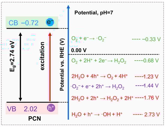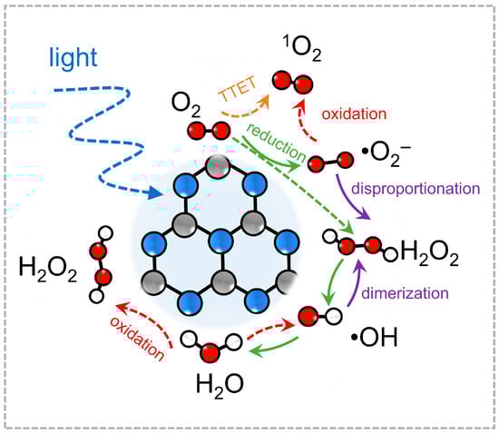 The feasibility of this process is fundamentally dictated by the relative position of the CB edge of PCN, which typically lies at approximately −1.3 V vs. RHE at a pH of 7, which is more negative than the standard redox potential of the O2/•O2− couple (−0.33 V) [44,45]. This favorable thermodynamic alignment enables spontaneous electron transfer from photoexcited PCN to dissolved oxygen, especially under anaerobic-free, neutral-to-alkaline aqueous conditions. In PCN systems, the generation of •O2− is influenced not only by the CB potential but also by the efficiency of charge carrier separation and migration to the surface. The extended π-conjugation and layered structure of PCN facilitate charge delocalization, while defect states and surface terminations may serve as anchoring sites for O2 adsorption and activation. Adsorbed O2 molecules first accept a single electron from the conduction band of photoexcited PCN, forming •O2− on the surface. These •O2− species can either directly oxidize substrates or undergo protonation to form hydroperoxyl radicals (•OOH). Subsequent electron/proton transfer or disproportionation reactions convert •OOH into H2O2, which can further decompose via Fenton-like or photolytic processes to generate •OH. Collectively, this sequence establishes a dynamic ROS network in which O2 is stepwise transformed from •O2− to •OOH, then to H2O2, and finally to •OH, enabling multiple oxidative pathways on PCN surfaces.