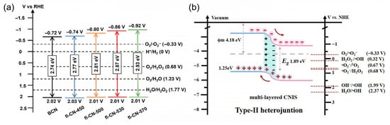 •O2− occupies a privileged niche among photocatalytic reactive oxygen species: less aggressive than hydroxyl radicals yet sufficiently long-lived to engage in selective oxygenation and downstream, value-adding transformations [57,58,59]. Realizing this control requires more than enhanced light absorption or longer carrier lifetimes, it demands the precise alignment of the catalyst’s electronic states with the thermodynamics of oxygen reduction. In practice, elevating and tailoring the conduction-band edge of PCN, while concurrently engineering interfacial adsorption sites, provides the thermodynamic drive and the local environment needed for efficient one-electron O2 reduction without promoting undesirable deeper reduction or radical leakage. In this section, we therefore discuss energy band engineering strategies to favor selective •O2− formation on PCN.