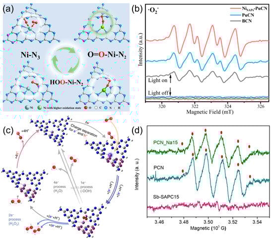 The indirect 2e− ORR pathways for production of H2O2: (a) schematic diagram of single-atom Ni structure evolution of NiSAPs-PuCN, (b) EPR signals of •O2− of NiSAPs-PuCN in the presence of DMPO. Reproduced from ref. [81] with permission from Springer Nature. The direct 2e− ORR pathways for production of H2O2: (c) schematic diagram of single-atom Sb structure evolution of Sb-SAPC, (d) EPR signals of •O2− of Sb-SAPC in the presence of DMPO. Reproduced from ref. [80] with permission from Springer Nature.