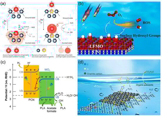 Figure 5a illustrates the direct energy transfer pathway for 1O2 generation on carbonyl-functionalized carbon nitride (Ox-CN) [46]. In this system, molecular oxygen is activated not by charge transfer, but via an energy transfer process. Upon photoexcitation, Ox-CN generates excitons, which undergo intersystem crossing (ISC) from singlet (S) to triplet (T) states. The carbonyl groups introduced into the PCN backbone serve as spin-orbit coupling (SOC) centers, significantly enhancing ISC efficiency by reducing the S-T energy gap. The triplet excitons transfer energy to the triplet ground state of molecular oxygen, promoting it to generating 1O2. This direct sensitization mechanism is further corroborated by the phosphorescence spectra shown in Figure 5b. Compared to pristine PCN, Ox-CN exhibits a stronger phosphorescence signal, which is a signature of an enhanced triplet-state population. Such a strategy not only enables efficient 1O2 production under visible light but also avoids the generation of potentially harmful radicals like •OH or •O2−, thereby improving the selectivity and safety of photocatalytic processes. Figure 5c illustrates an alternative and equally compelling pathway for 1O2 formation [86]: the indirect hole-driven oxidation of •O2−. In this mechanism, photogenerated electrons in the CB of chemically modified PCN first reduce molecular oxygen to •O2−. Subsequently, this superoxide radical anion is oxidized by VB holes to yield 1O2, completing a two-step redox loop. The strategic promotion of •O2− generation and its subsequent oxidation by photogenerated holes offers a redox-closed-loop mechanism that maximizes charge carrier utilization while minimizing energy waste and radical overproduction. This indirect route not only expands the functional capacity of PCN but also provides a selectivity advantage in treating complex aqueous matrices, in which indiscriminate oxidants may generate harmful intermediates.