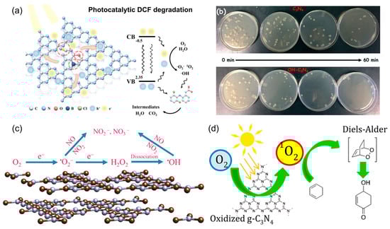 - Xu, L.; Li, L.; Yu, L.; Yu, J.C. Efficient generation of singlet oxygen on modified g-C3N4 photocatalyst for preferential oxidation of targeted organic pollutants. Chem. Eng. J. 2022, 431, 134241. [Google Scholar] [CrossRef]