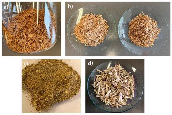 Pictures of fractionated biomasses. (a) Brewer’s spent grain; (b) Rice Husks (raw on the left and parboiled on the right); (c) rapeseed cake (powdered); (d) hemp hurds.