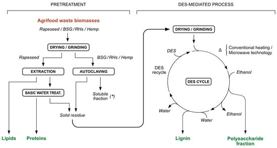 Complete DES-mediated fractionation multistep process for the waste biomasses. Soluble fraction (*) contains monosaccharides, β-glucans, and hemicelluloses.
