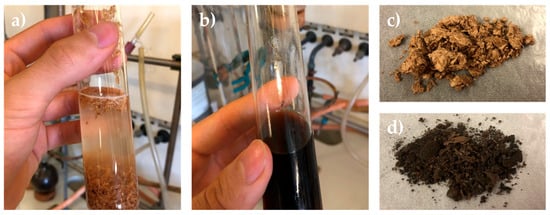 Different steps of biomass fractionation (reported here for brewer’s spent grain): (a) suspension of the biomass in DESs; (b) solubilization of biomass in a DES-mediated process; (c) recovered polysaccharide fraction; (d) recovered lignin fraction.