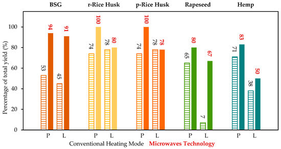 Figure 4 illustrates the yields of the polysaccharide and lignin fractions, comparing the results obtained using the conventional thermal mode (dashed bars) with those achieved through microwave-assisted processing (solid bars). The data clearly demonstrate that microwave irradiation significantly enhances the extraction efficiency for both fractions across all investigated biomass types. Notably, BSG exhibits a two-fold increase in yield for both fractions, while rapeseed shows a ten-fold enhancement in lignin recovery, highlighting the pronounced effect of microwave-assisted extraction on process performance. Also, the comparison between the CHM and MWT demonstrates that microwave technology could greatly enhance the final yields of the fractions, leading to nearly 0% remaining of final unfractionated residue.