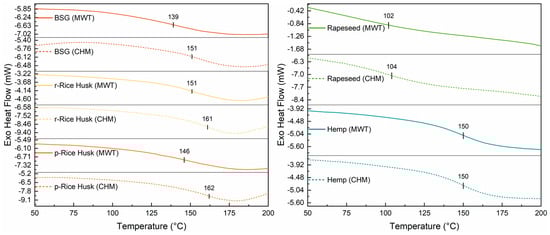 DSC second heating run of lignin extracted from (left) brewers’ spent grain (BSG), raw Rice Husks (r-Rice Husk), and parboiled Rice Husks (p-Rice Husk), as well as from (right) Rapeseed and Hemp lignocellulosic biomasses via either the conventional heating mode (CHM) or microwave (MWT) treatment. Estimated standard errors ± 3 °C.