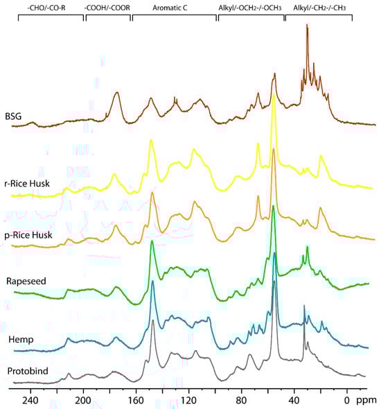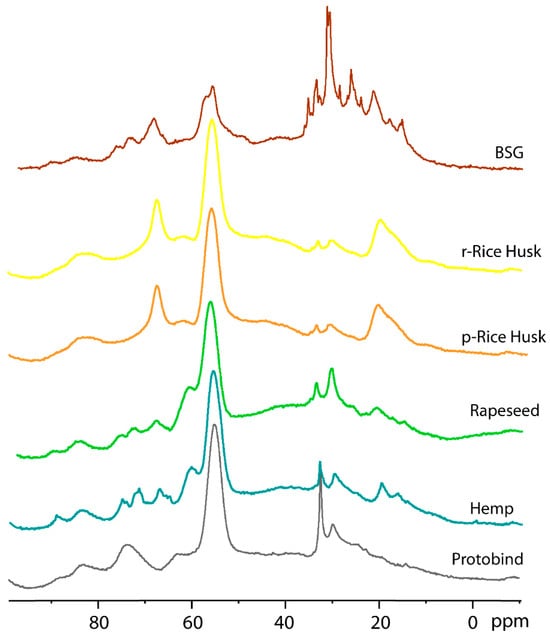 The effect of different types of treatment (conventional heating mode vs. microwave technology) on the structure and morphology of lignin was studied using 13C CP-MAS NMR on r- and p-Rice Husk extracted lignin samples (spectra reported in Figure S4). In both cases, the 13C CP-MAS spectra show a similar pattern, showing that no significant transformations or alterations occurred during the microwave treatment compared to the conventional heating mode. These data confirm the results already described in the previous sections. In the following Figure 8, the NMR spectra of the presently extracted lignin samples, obtained from different bio-sources and treated with the microwave-based procedure, are compared. Figure 8 shows the 13C CP-MAS spectra of the extracted lignin samples (BSG, r-Rice Husk, p-Rice Husk, Rapeseed, and Hemp) and the Protobind commercial lignin (grey line) for comparison.