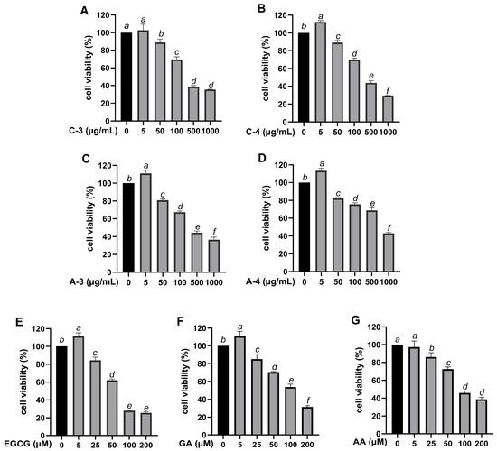 Cytotoxic effects of Brazilian pepper leaf extracts and standard antioxidants on HaCaT cells assessed by the SRB assay. (A–D) Cell viability after treatment with extracts C-3, C-4, A-3, and A-4 at concentrations of 0, 5, 50, 100, 500, and 1000 µg/mL. (E–G) Cell viability after treatment with epigallocatechin gallate (EGCG), gallic acid (GA), and ascorbic acid (AA) at concentrations of 0, 5, 25, 50, 100, and 200 µM. All values are expressed as mean ± SD (n = 3). Untreated cells served as the control. Statistical analyses were conducted using one-way ANOVA followed by Tukey’s post hoc test. Different letters above the bars indicate statistically significant differences among groups (p < 0.05).