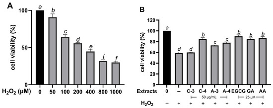 Cytoprotective effects of Brazilian pepper leaf extracts against hydrogen peroxide (H2O2)-induced oxidative stress in HaCaT cells. (A) Cell viability of HaCaT cells treated with increasing concentrations of H2O2 (100–1000 µM) for 24 h. (B) Protective effects of extract pre-treatment (50 µg/mL) and epigallocatechin gallate (EGCG), gallic acid (GA), and ascorbic acid (AA) (25 µM) prior to exposure to 200 µM H2O2. Data are presented as mean ± SD (n = 3). Statistical analysis was performed using one-way ANOVA followed by Tukey’s post hoc test. Different letters above the bars indicate statistically significant differences among groups (p < 0.05).