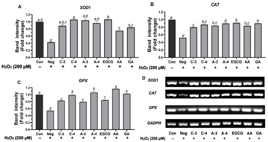 Effects of Brazilian pepper extracts on antioxidant gene expression in hydrogen peroxide (H2O2)-induced HaCaT cells. (A) SOD1, (B) CAT, (C) GPX mRNA expression levels, and (D) representative gel images. HaCaT cells were pre-treated with extracts (50 µg/mL) or standards (epigallocatechin gallate (EGCG), gallic acid (GA), ascorbic acid (AA); 25 µM) prior to exposure to H2O2 (200 µM). Control = untreated cells; NEG = negative control (cells treated with H2O2 only). mRNA expression levels were normalized to GAPDH as the housekeeping gene. Data are presented as mean ± SD (n = 3). Statistical analysis was performed using one-way ANOVA followed by Tukey’s test. Bars with different letters indicate significant differences (p < 0.05).