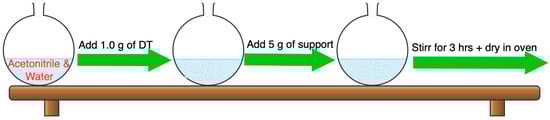 In this study, silica (SiO2), alumina (Al2O3), titanium dioxide (TiO2), and glass wool were chosen as supports for the preparation of heterogeneous catalysts. The synthesis process involved three main steps. Initially, 1 g of decatungstate salt was dissolved in a mixture of 60 mL acetonitrile and 15 mL deionized water in a spherical flask equipped with a rotary evaporator. Subsequently, 5 g of the selected support material was added to the solution. The resulting suspension was subjected to rotation for 3 h, followed by evaporation over 2 h at 30 °C. Finally, the solid was dried overnight in an oven at 120 °C. The procedure is graphically summarized in Figure 1, leading to the catalytic materials used in this contribution.