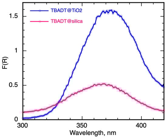 Diffuse reflectance (DR) measurements were conducted on heterogeneous catalysts, including glass wool, silica, alumina, and titanium dioxide, to assess the successful attachment of DT to the supports. These measurements are typically performed against a totally reflective standard, but in our case, we opted to use Spectralon as the reference, except for DT@TiO2, where powdered TiO2 was the reference. This ensured that the recorded spectra clearly indicated whether DT had been adsorbed and if its absorbance was suitable for the UVA irradiation employed in most of the experiments. Figure 2 shows representative DR spectra, while additional data are provided in the Supplementary Information. As already noted, the spectra in Figure 2 have been recorded with the corresponding support, TiO2 or spectralon, as a reference. All other DR spectra are included in the Supplementary Information. Even for F(R) ~ 0.5, about 50% of the light is reflected, based on the Kubelka–Munk expression [19]. Both maxima are red-shifted with respect to solution values. The larger shift for TBADT@TiO2 likely reflects that, with a band gap of ~3.1 eV, the TiO2 reference essentially absorbs all the light in the shorter region of the UVA spectrum.