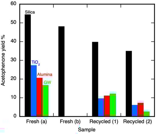 UVA irradiation of 1-phenylethanol (0.1 M) in chloroform for 24 h under oxygen was performed using silica (black), TiO2 (blue), alumina (red), or glass wool (green) as supports for TBADT. The supports were not pre-treated with APTES. The silica sample was run in duplicate, and all samples were recycled twice. The details of the sample preparation for recycling are provided in the Materials and Methods section.