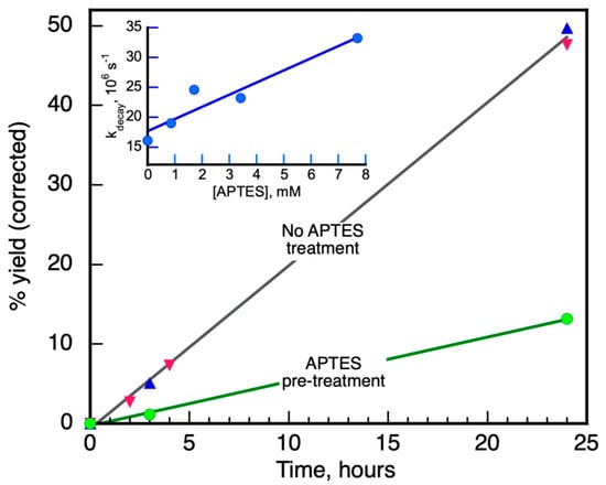 The main plot shows the evolution of the acetophenone yield with time for irradiations in the setup shown in Figure 3. The lines show (red and blue triangles) a linear fit in both cases, with correlation coefficients > 0.999. The red and blue triangles correspond to duplicate experiments with TBADT@silica. These data have been corrected by subtracting any acetophenone detected before irradiation. The green data correspond to yields obtained with silica that had been pre-treated with APTES. The inset shows the effect of APTES on the rate constant for the decay of 3DT* phosphorescence in acetonitrile following 355 nm excitation and monitored at 1270 nm; the slope corresponds to the bimolecular rate constant for 3DT* quenching by APTES (see Figure S3).