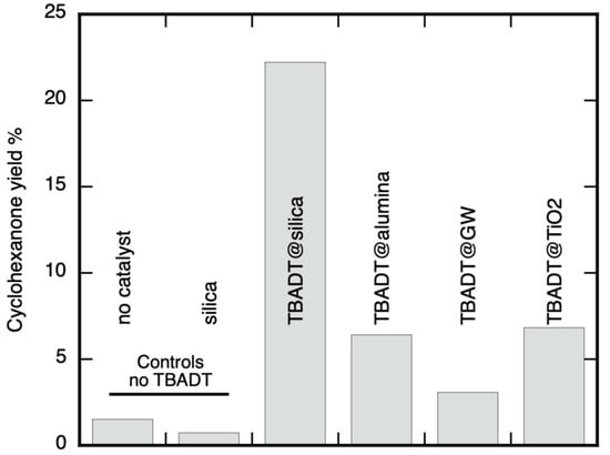 The oxidation of cyclohexanol was investigated to assess the performance of our novel photocatalysts beyond the aromatic alcohols discussed earlier. These studies are similar to those depicted in Figure 4 and resulted in the reaffirmation of TBADT@silica as the preferred catalyst, as illustrated in Figure 6.