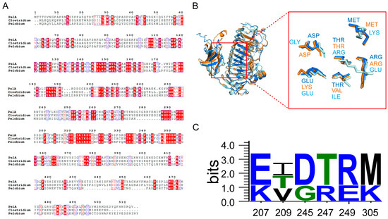 The sequence and structural alignment of pectinases is presented as follows: (A) The conservation analysis of PelA (Paenibacillus), SEW03055 (Clostridium), and RKD12910 (Pelobium) reveals that the red background indicates fully conserved amino acids, while the blue boxes represent specific structural or functional regions. (B) The structural alignment of pectinases PelA, SEW03055, and RKD12910 is illustrated, with PelA, SEW03055, and RKD12910 represented in blue, orange, and pale cyan, respectively. Specific amino acid residues involved in the active site or ligand interactions are highlighted. (C) The conservation analysis of key residues is also included.