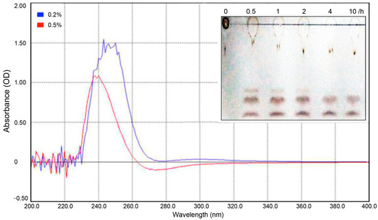 This study analyzes the products of PGA digested with the pectinase PelA. The digested products of PGA were scanned at wavelengths ranging from 200 nm to 400 nm. Additionally, a TLC analysis of the PGA products is presented. Line 1 represents the PGA substrate, while lines 2 to 6 correspond to the PGA products digested by PelA at 55 °C for durations of 0.5 h, 1 h, 2 h, 4 h, and 10 h, respectively.